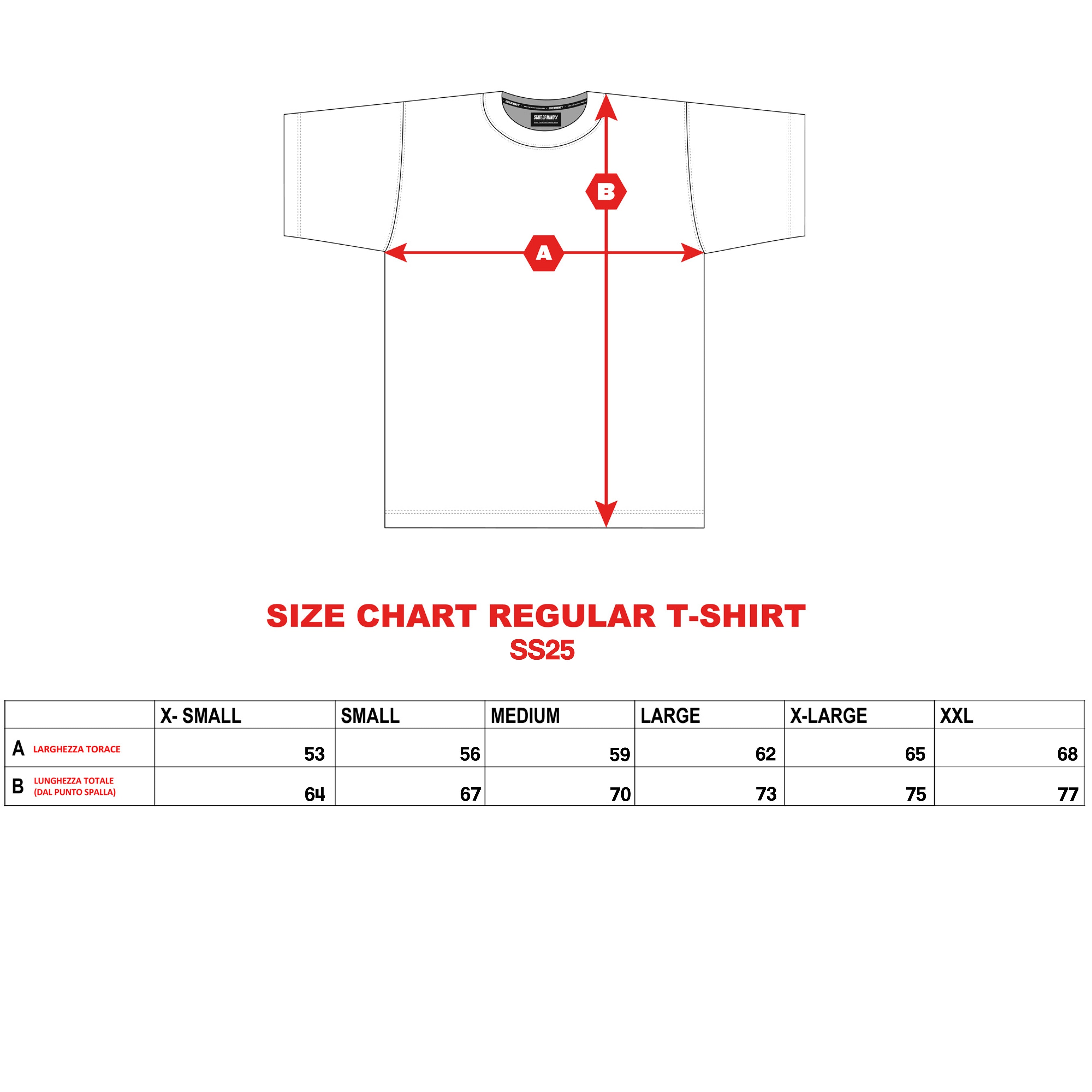 100% cotone 220g, stampa fronte/retro, vestibilità regolare. Flag in feltro.