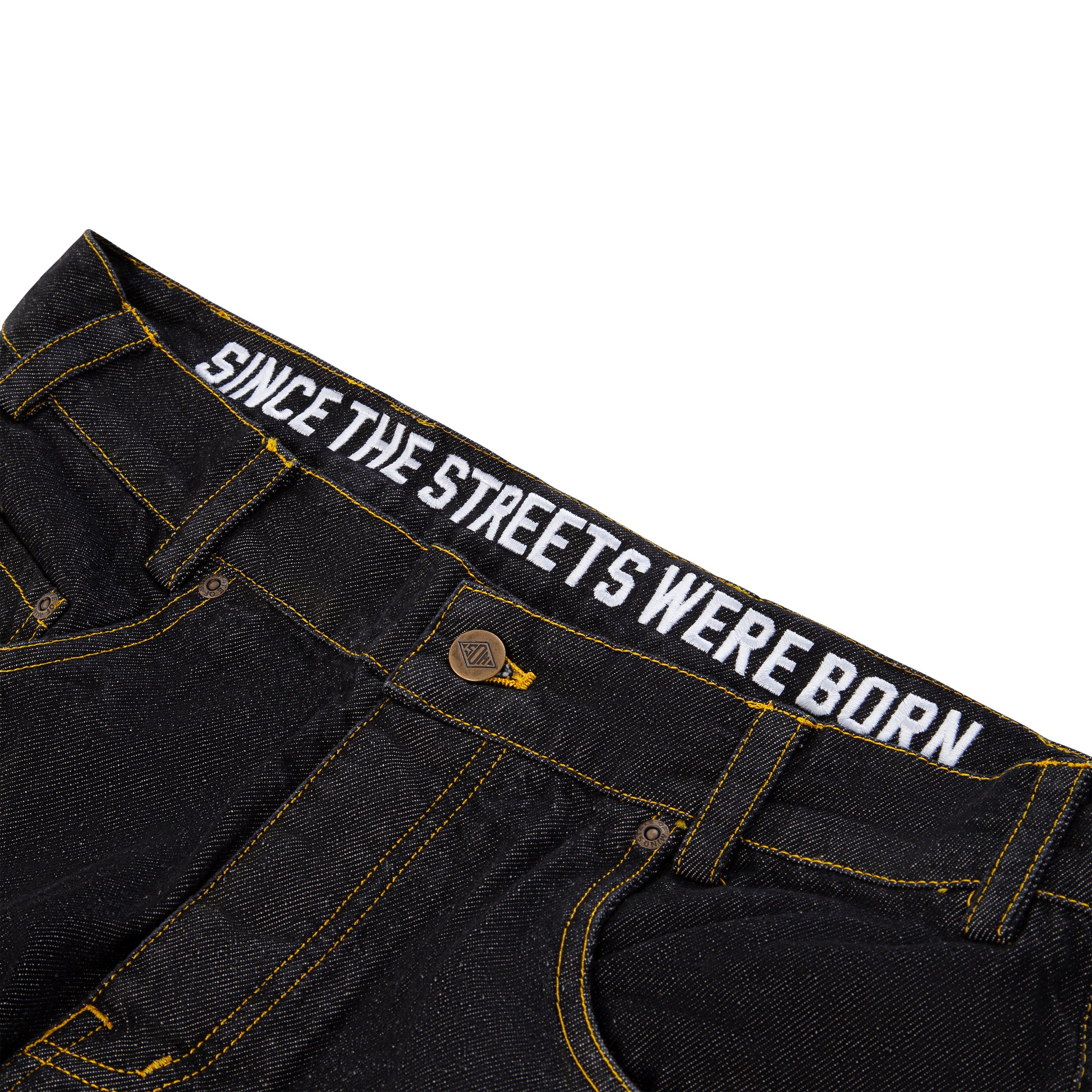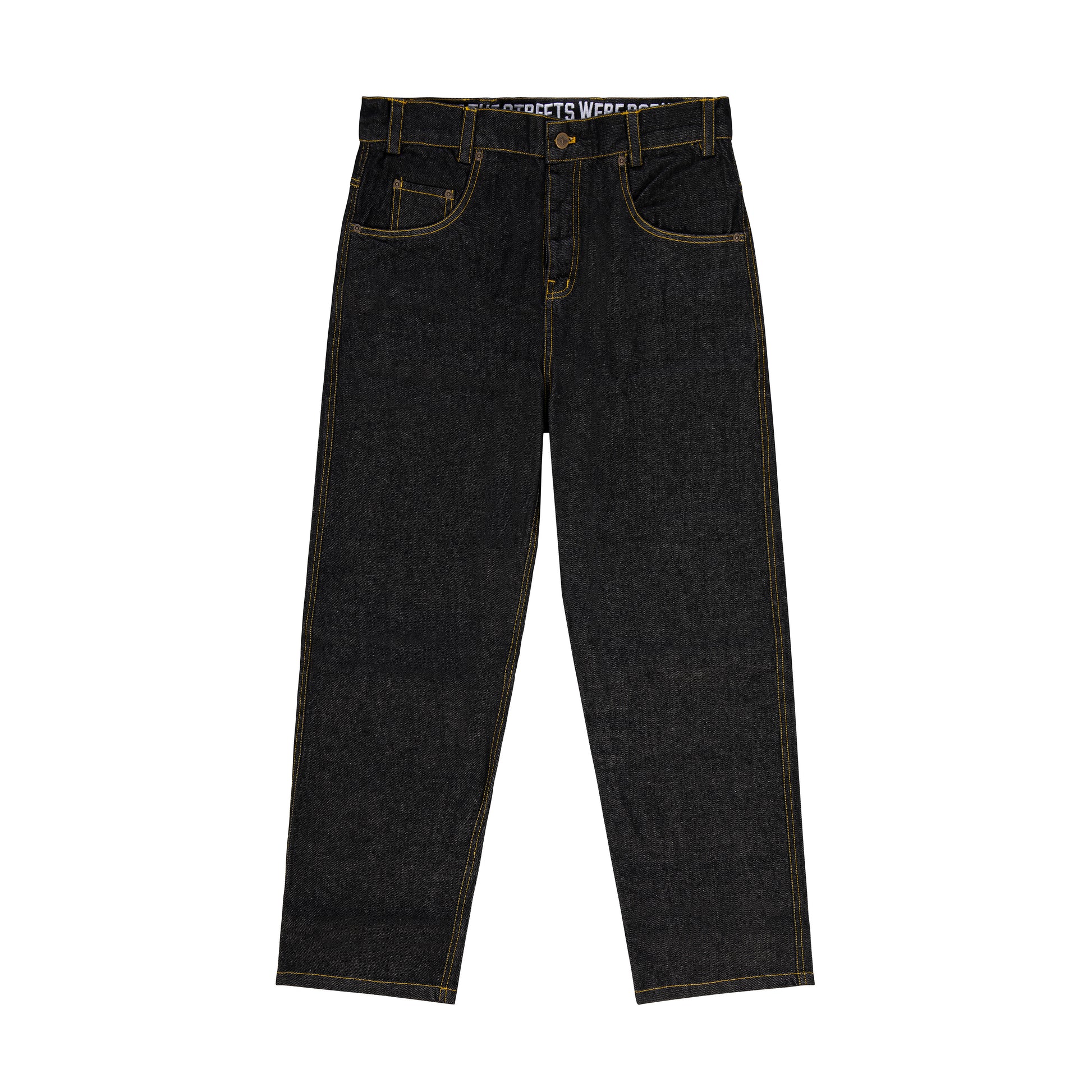 "BOX LOGO" Jeans Baggy nero,100% cotone denim 13oz, 2 tasche frontali, 1 taschino, 2 tasche posteriori, chiusura con bottoni, ricamo interno, salpa in cuoio.