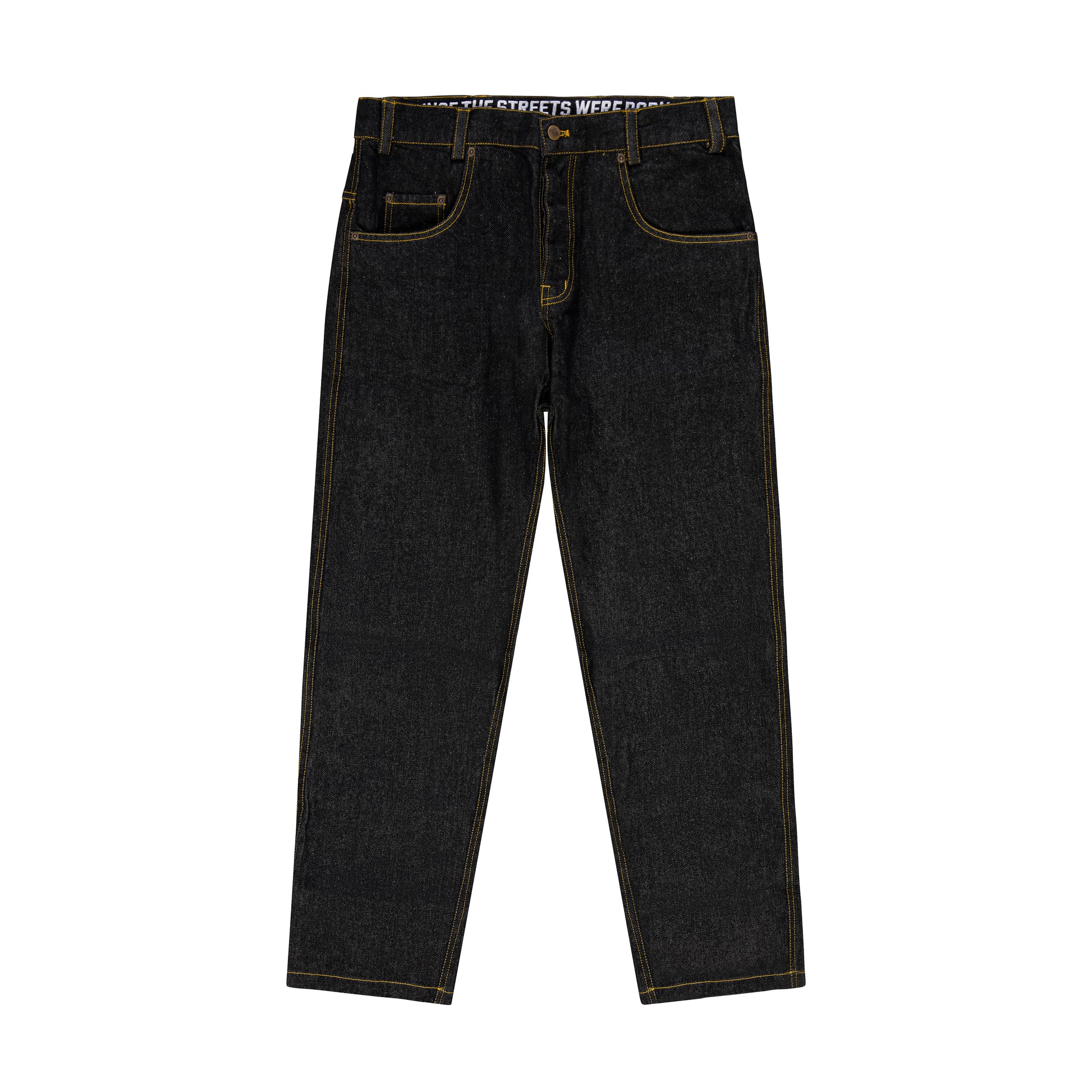 "BOX LOGO" Jeans Relaxed fit nero, 100% cotone denim 13oz, 2 tasche frontali, 1 taschino, 2 tasche posteriori, chiusura con bottoni, ricamo interno, salpa in cuoio.