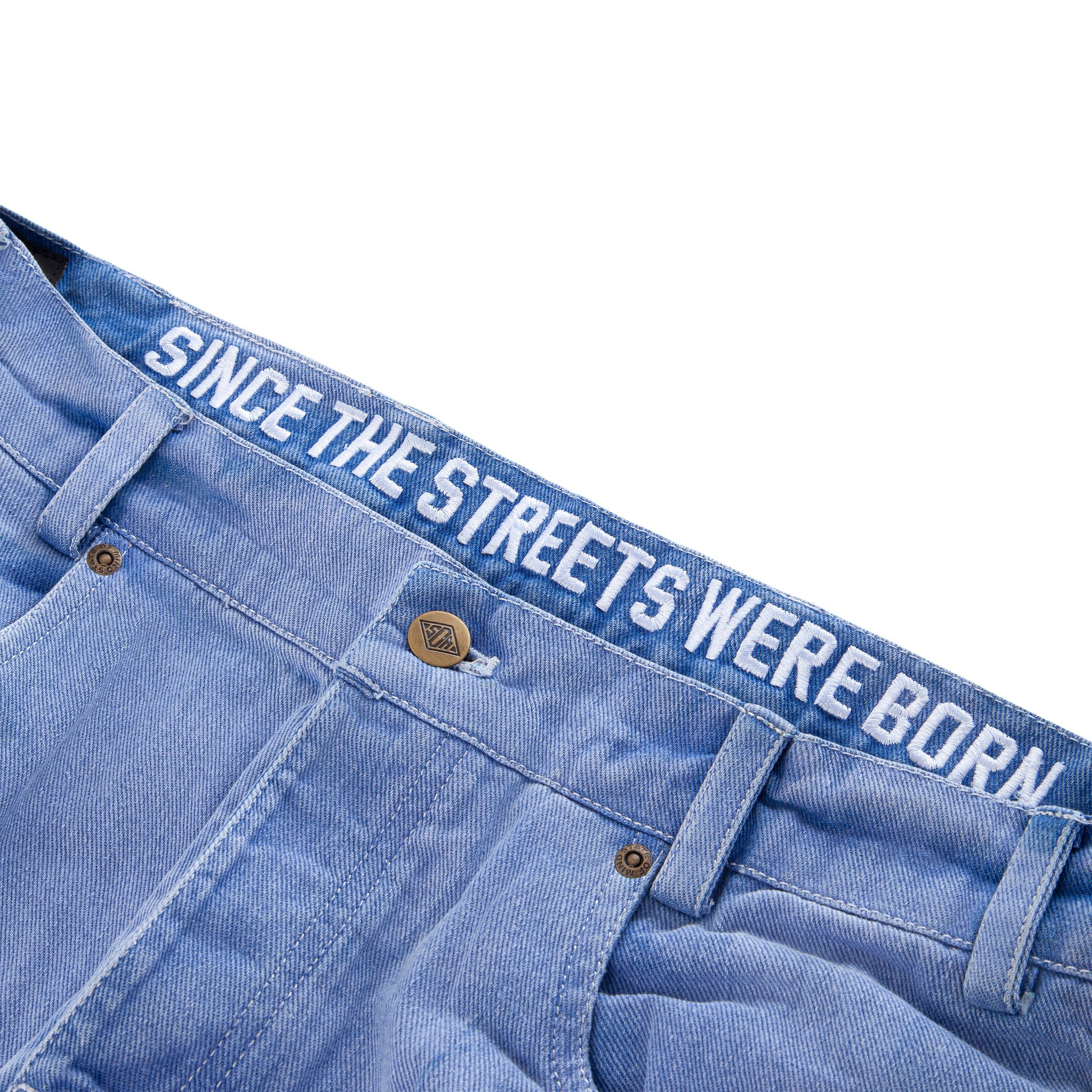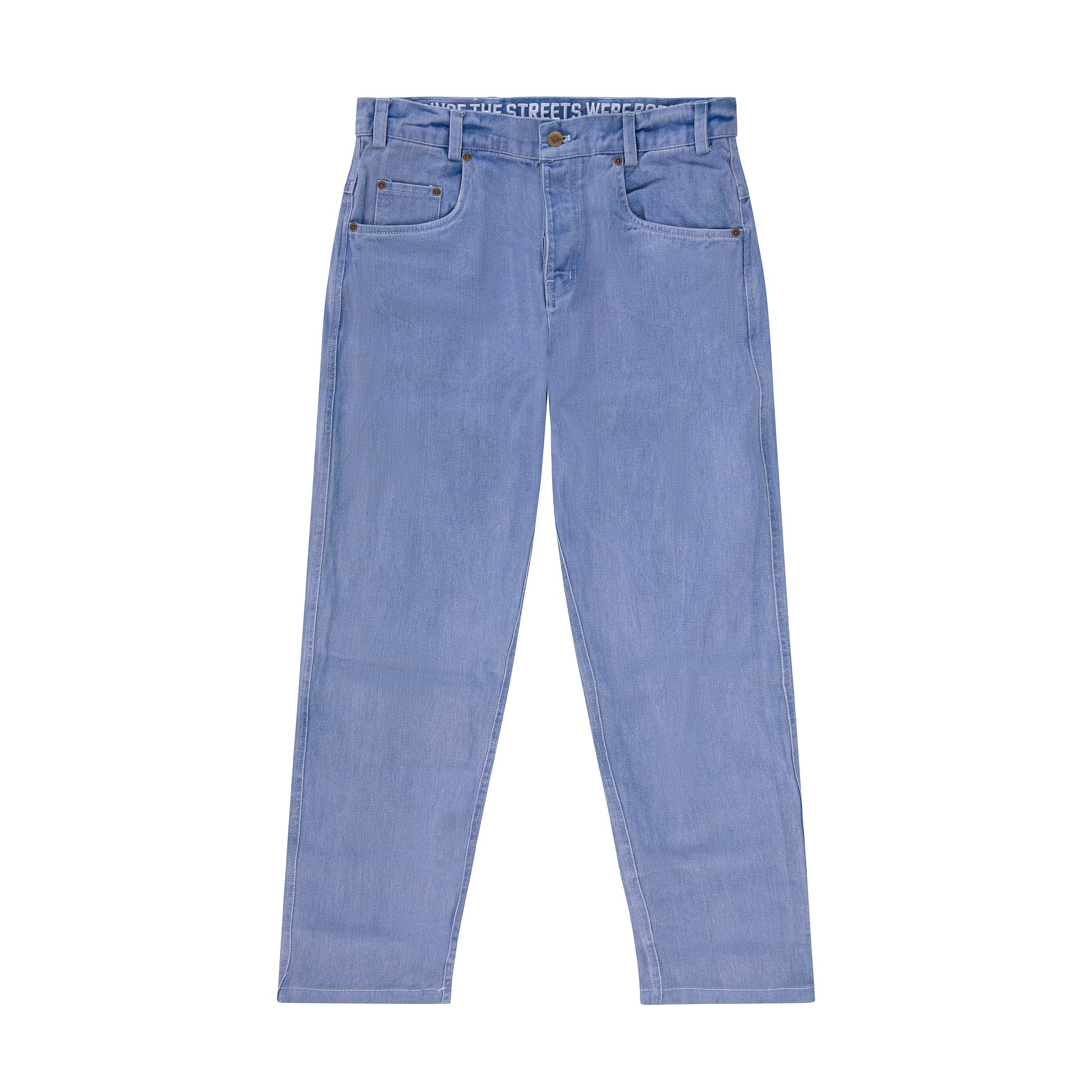"BOX LOGO" Jeans Relaxed fit denim chiaro, 100% cotone denim 13oz, 2 tasche frontali, 1 taschino, 2 tasche posteriori, chiusura con bottoni, ricamo interno, salpa in cuoio.