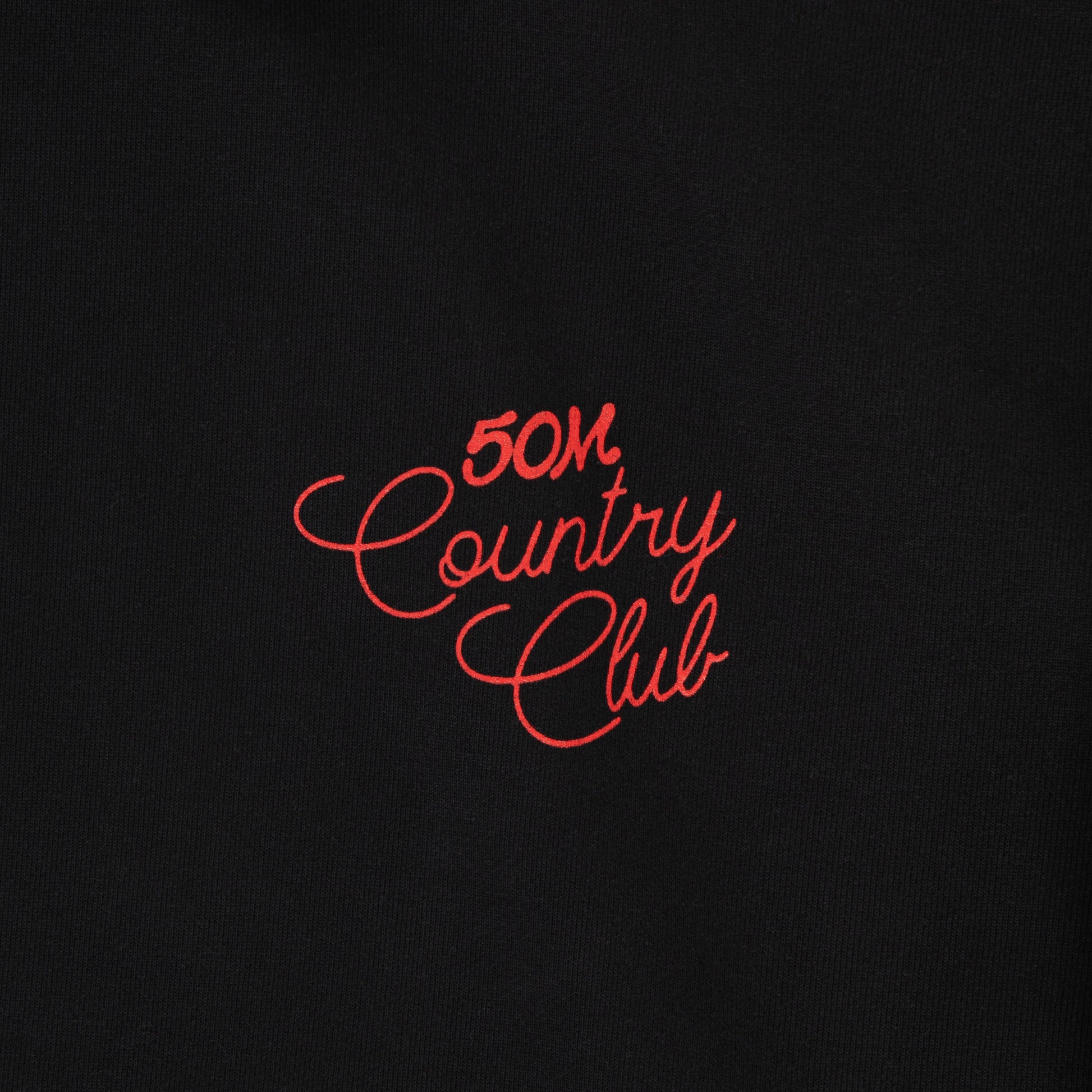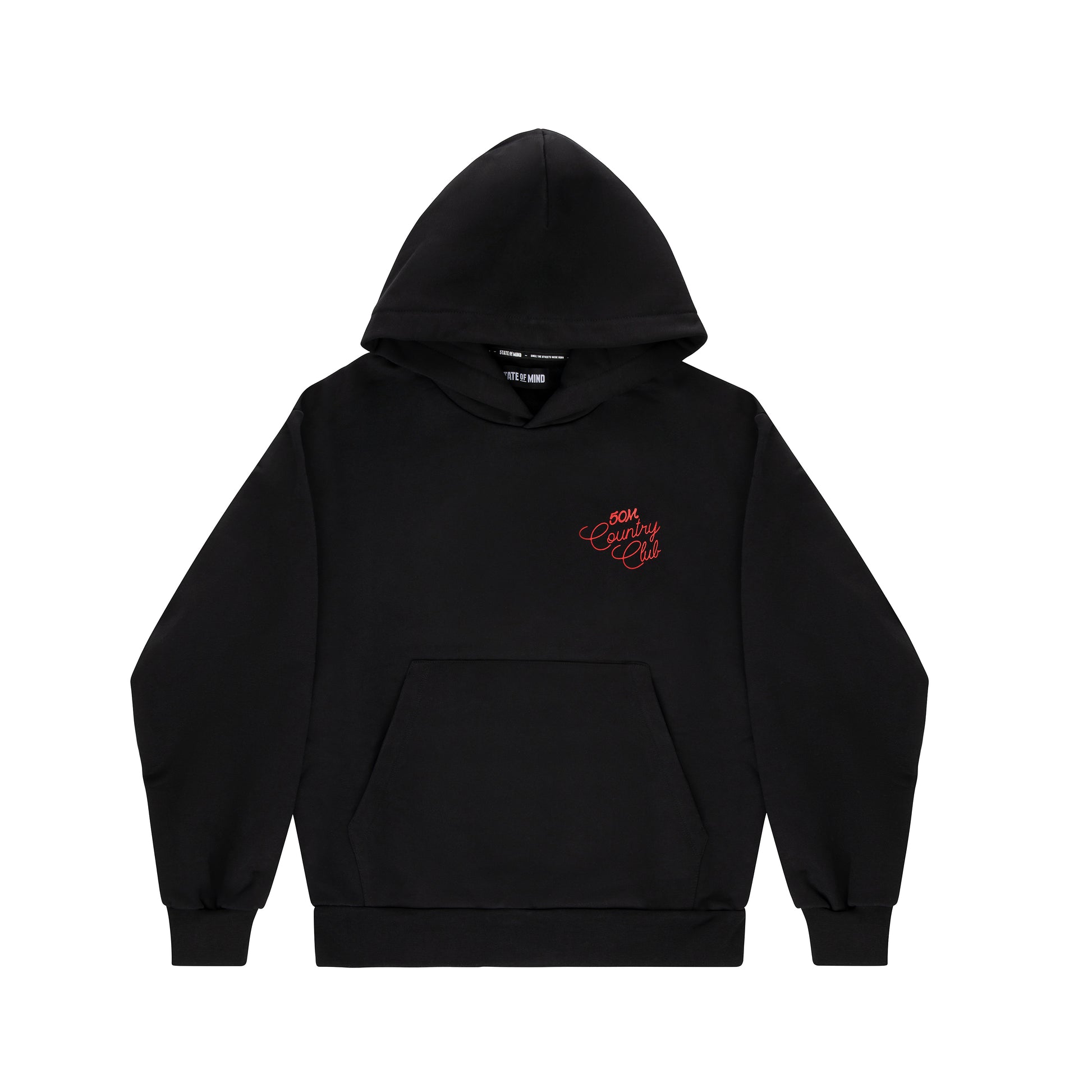 "COUNTRY CLUB" Felpa cappuccio nera, 100% cotone 380g, stampa fronte/retro, tasca marsupio, vestibilitĂ regolare.