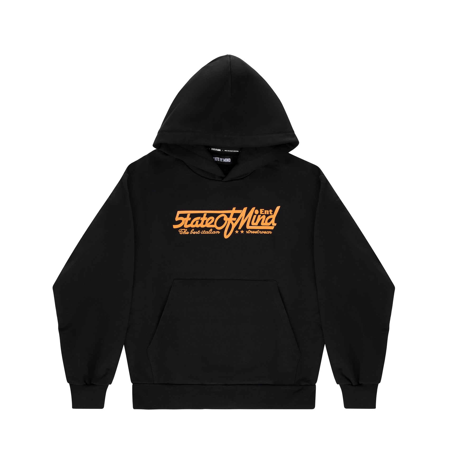 "5OM ENT." Felpa cappuccio nera, 100% cotone 380g, stampa frontale, tasca marsupio, vestibilitĂ regolare.