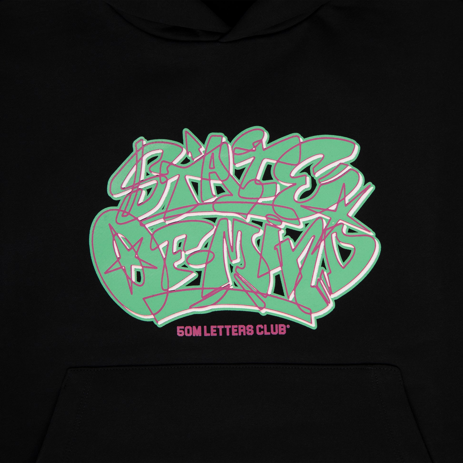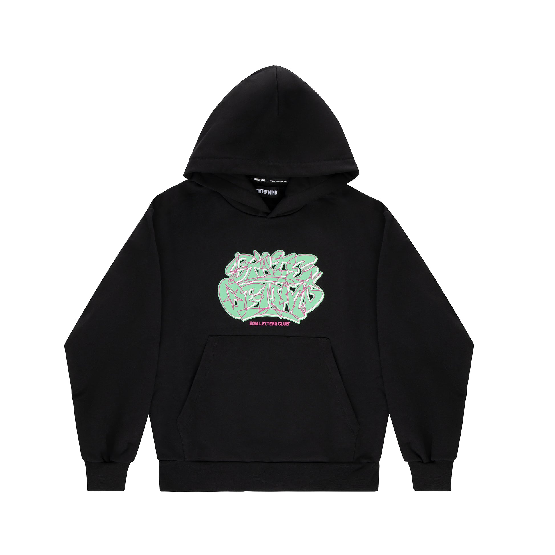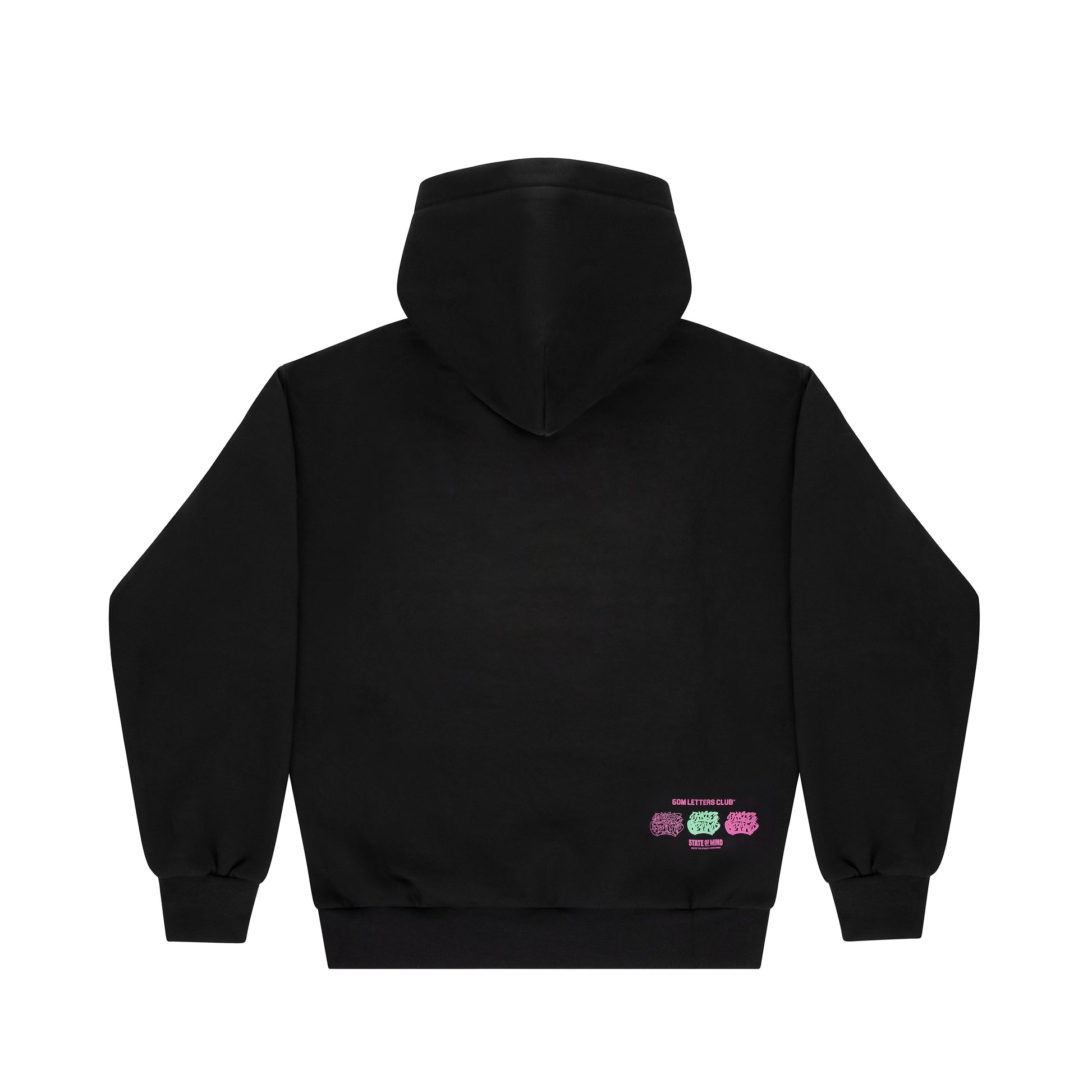 "LETTERS STUDIO" Felpa cappuccio nera, 100% cotone 380g, stampa fronte retro, tasca marsupio, vestibilità REGOLARE.