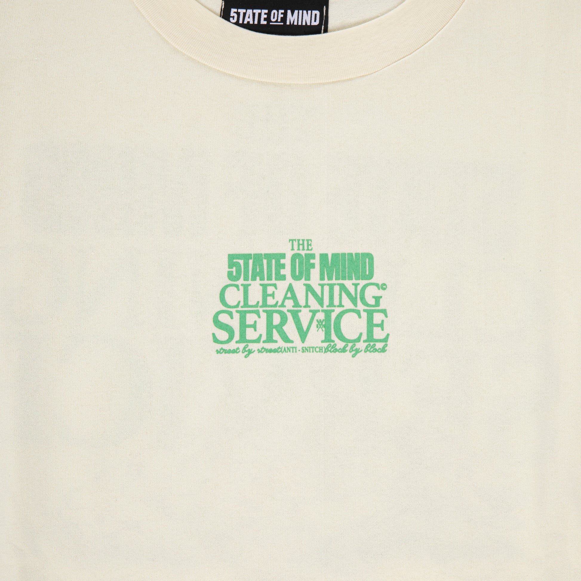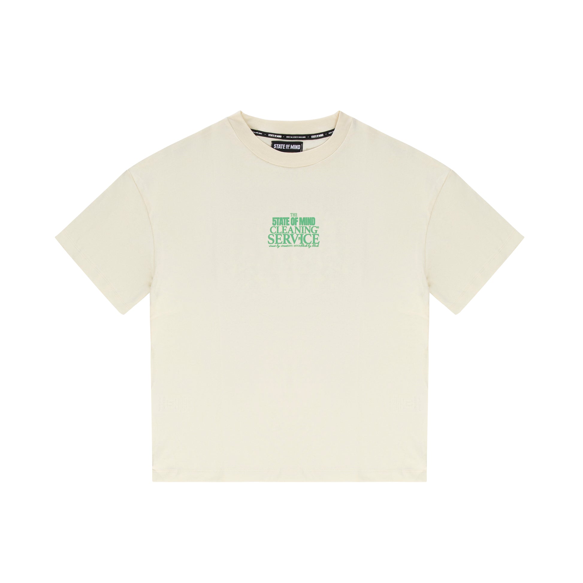 "CLEANING SERVICE" T-Shirt Off White, 100% cotone 220g, stampa fronte/retro, vestibilità Loose.