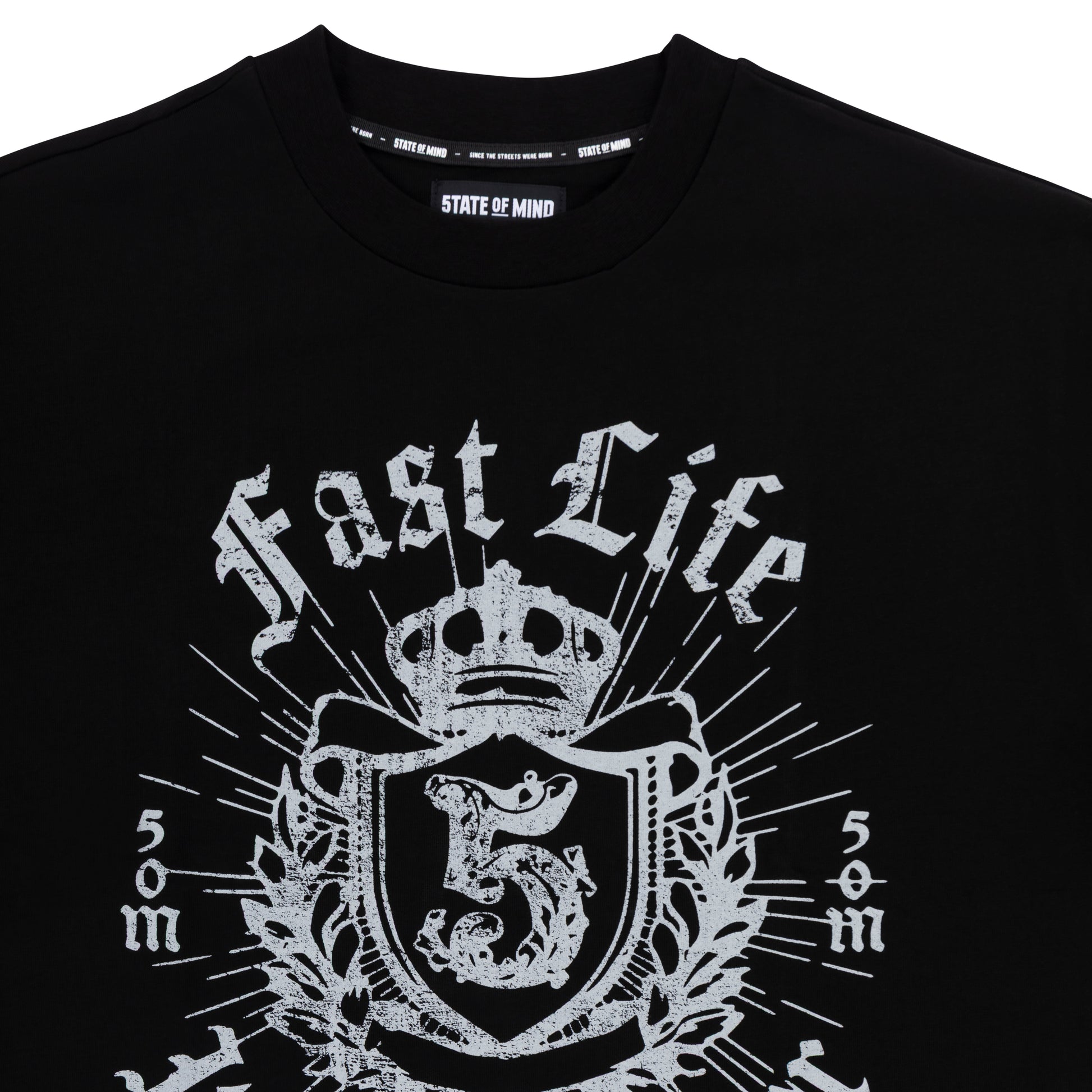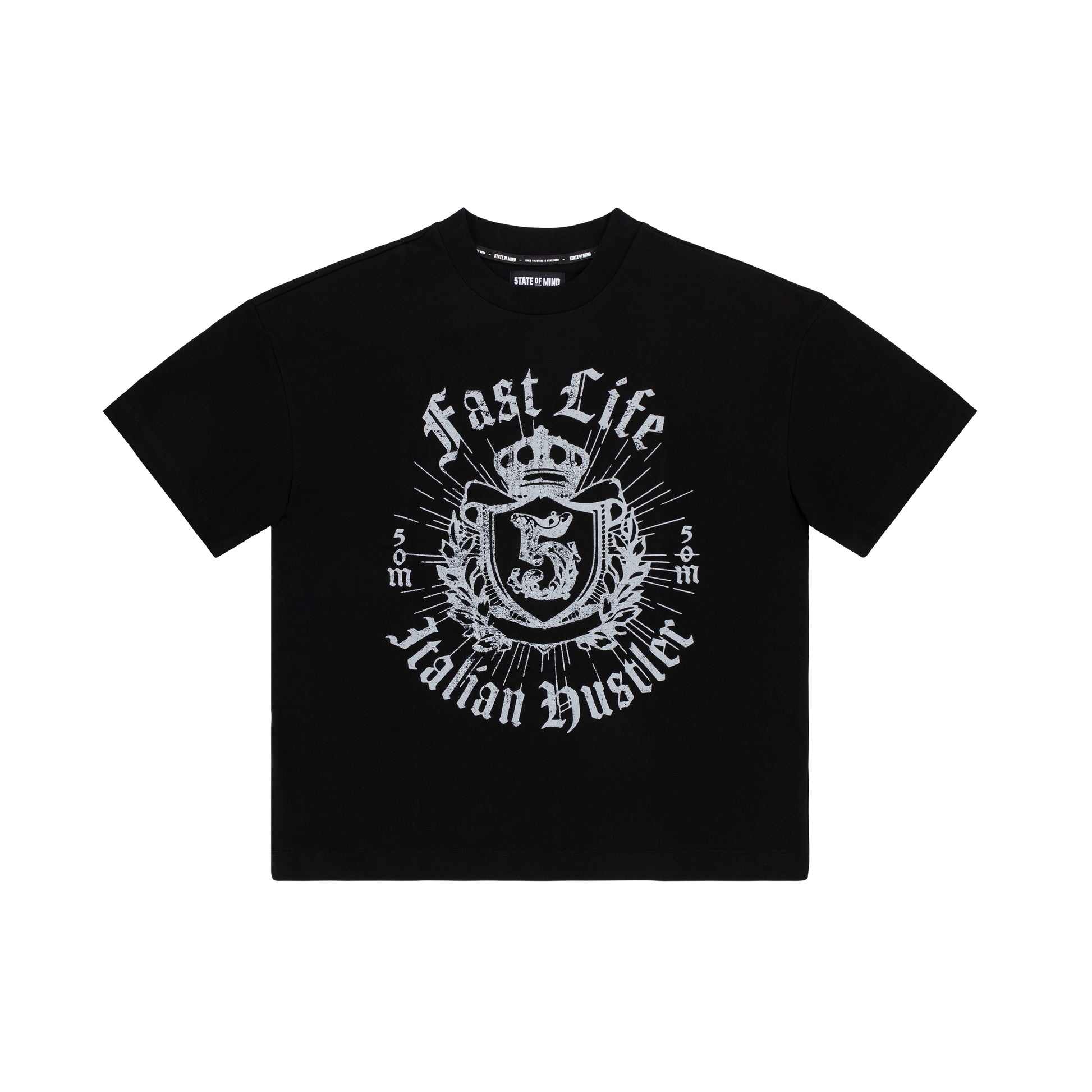 "HUSTLER FAST" by Guè T-shirt black, 100% cotone 220g, stampa fronte, vestibilità Loose.