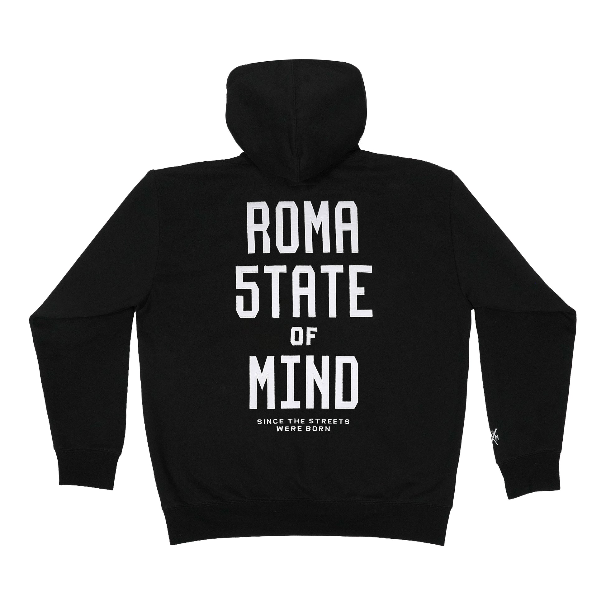 "ROMA 5TATE OF MIND" Felpa cappuccio nera, 80% cotone 20% poliestere 380g, applicazione tackle twill fronte/retro, vestibilità REGOLARE.